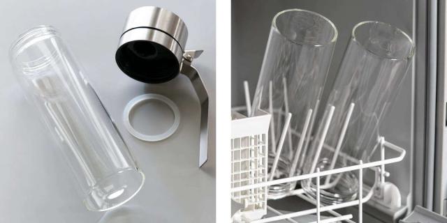 蓋を外し、パッキンも取り外すことができるので、しっかり洗えて衛生的です。またボトルは耐熱温度差120度のガラス素材なので、食洗機が使用でき、煮沸消毒も可能です。