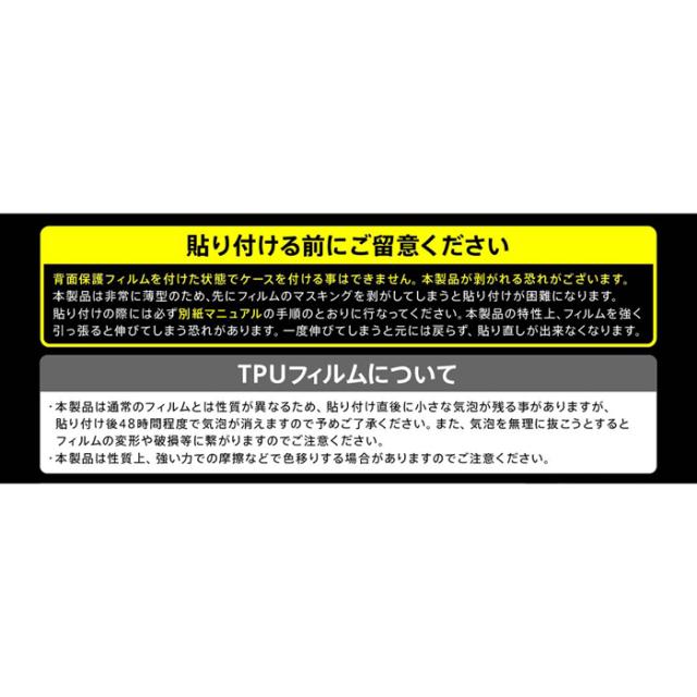 | 素材 | シリコン膜(背面保護フィルム吸着面)、TPU(背面保護フィルム表面) シリコン膜(カメラ保護フィルム吸着面)、PET(カメラ保護フィルム表面) |