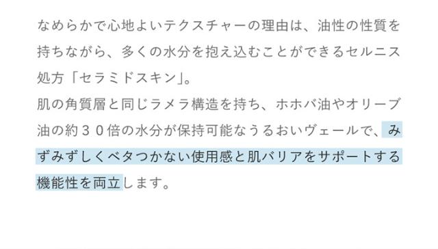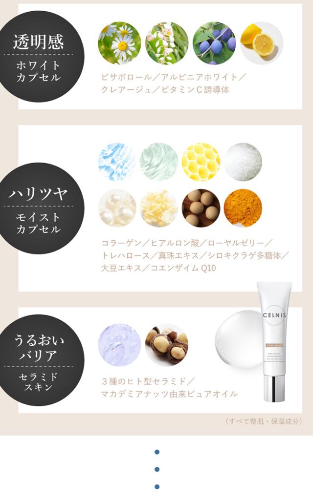 | 成分 | ○有効成分 水溶性プラセンタエキス、グリチルリチン酸2K ○その他の成分 ビサボロール、リン酸アスコルビルMg、アルピニアカツマダイ種子エキス、プルーン酵素分解物、水溶性コラーゲン液−4、水解コンキオリン液、トレハロース、シロキクラゲ多糖体、ローヤルゼリーエキス、大豆エキス、ユビデカレノン、ヒアルロン酸Na−2、海藻エキス−5、海藻エキス−1、ペンタステアリン酸デカグリセリル、ステアロイル乳酸Na、ステアロイルフィトスフィンゴシン、(2S,3R)−2−オクタデカノイルアミノオクタデカン−1,3−ジオール、ヒドロキシステアリルフィトスフィンゴシン、イソステアリン酸フィトステリル、ベヘニルアルコール、海水乾燥物、オレイン酸ジヒドロコレステリル、オレイン酸フィトステリル、ノナン酸コレステリル、酪酸コレステリル、酪酸ジヒドロコレステリル、マカデミアナッツ油脂肪酸フィトステリル、アルギニン、HClリジン、L−グルタミン酸ナトリウム、グリシン、HClヒスチジン、水解シルク液、ノバラエキス、水添大豆リン脂質、天然ビタミンE、塩化K、硫酸Mg、炭酸Ca、酢酸トコフェロール、トリメチルグリシン、グリコシルトレハロース・水添デンプン分解物混合溶液、濃グリセリン、POE(100)硬化ヒマシ油、トリエチルヘキサン酸グリセリル、BG、キサンタンガム、カルボキシビニルポリマー、アクリル酸・メタクリル酸アルキル共重合体、水酸化K、1,2−ペンタンジオール、フェノキシエタノール |