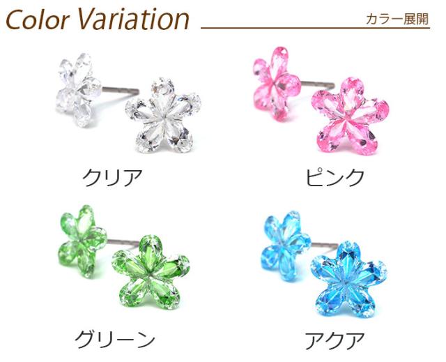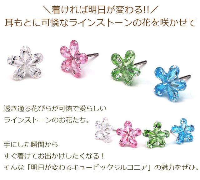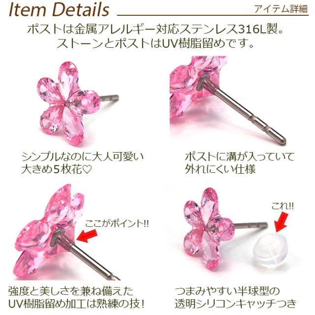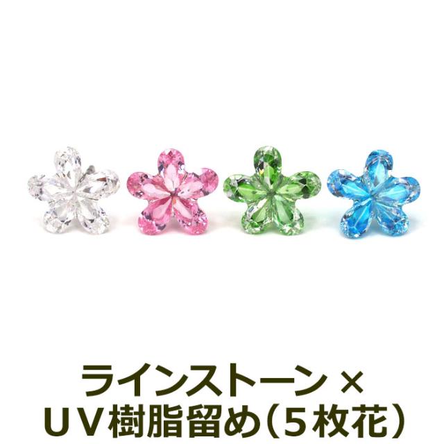 | 【当店オリジナル】明日が変わるキュービックジルコニア ラインストーン&UV樹脂留め加工 金属アレルギー対応 ステンレスピアス フラワー5枚花 |