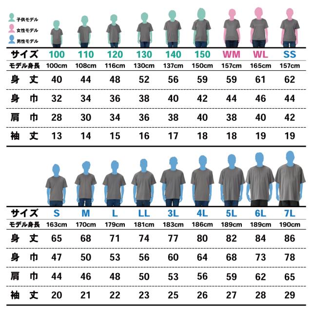 | サイズ(cm) | 全18サイズ 《100》身丈:40/身巾:32/肩幅:28/袖丈:13 《110》身丈:44/身巾:34/肩幅:30/袖丈:14 《120》身丈:48/身巾:36/肩幅:34/袖丈:15 《130》身丈:52/身巾:38/肩幅:36/袖丈:16 《140》身丈:56/身巾:40/肩幅:38/袖丈:17 《150》身丈:59/身巾:42/肩幅:40/袖丈:18 《WM》身丈:59/身巾:44/肩幅:38/袖丈:18 《WL》身丈:61/身巾:46/肩幅:40/袖丈:19 《SS》身丈:62/身巾:44/肩幅:42/袖丈:19 《S》身丈:65/身巾:47/肩幅:44/袖丈:20 《M》身丈:68/身巾:50/肩幅:46/袖丈:21 《L》身丈:71/身巾:53/肩幅:48/袖丈:22 《LL》身丈:74/身巾:56/肩幅:50/袖丈:23 《3L》身丈:77/身巾:60/肩幅:53/袖丈:25 《4L》身丈:80/身巾:64/肩幅:56/袖丈:26 《5L》身丈:82/身巾:68/肩幅:59/袖丈:27 《6L》身丈:84/身巾:73/肩幅:62/袖丈:28 《7L》身丈:86/身巾:78/肩幅:65/袖丈:29 |