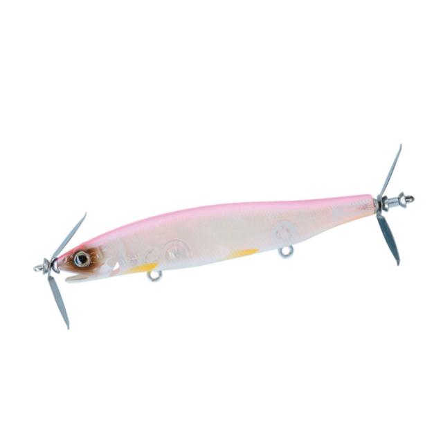 投げて巻くだけで魚を引き寄せるシンキングプロップベイト。表層付近をスローに引くことができ、かつベイトフィネスタックルでも十分な飛距離を稼げるように設計。ヘッド部分にはウォータースルーギル構造を採用し、ノー感じになりやすいプロップベイトにわずかに引き抵抗をプラス。集中して使用できるプロップベイトに仕上がっている。極薄に設計されたペラはスローに引いてもしっかり回転してバスにアピール。テール部分には金属の筒状パーツを配備してペラとフックの距離をとることで、ペラがガードになってフッキングしないという現象を解消。フック自体はサクサスフックを搭載し、ショートバイトもからめ取っていくことが可能。