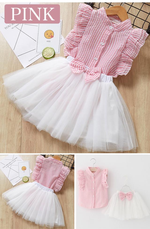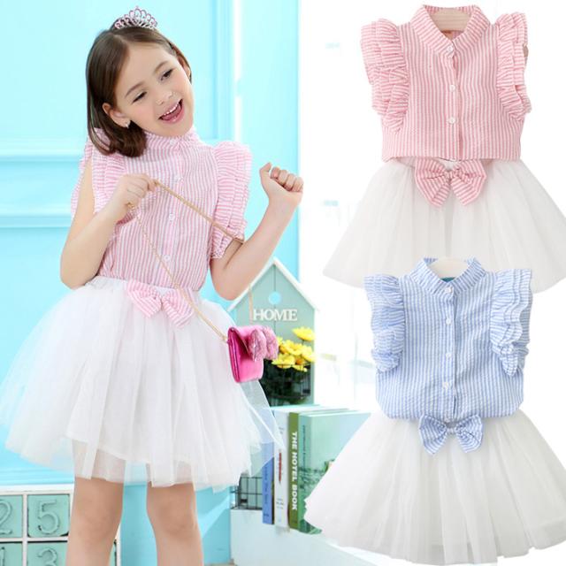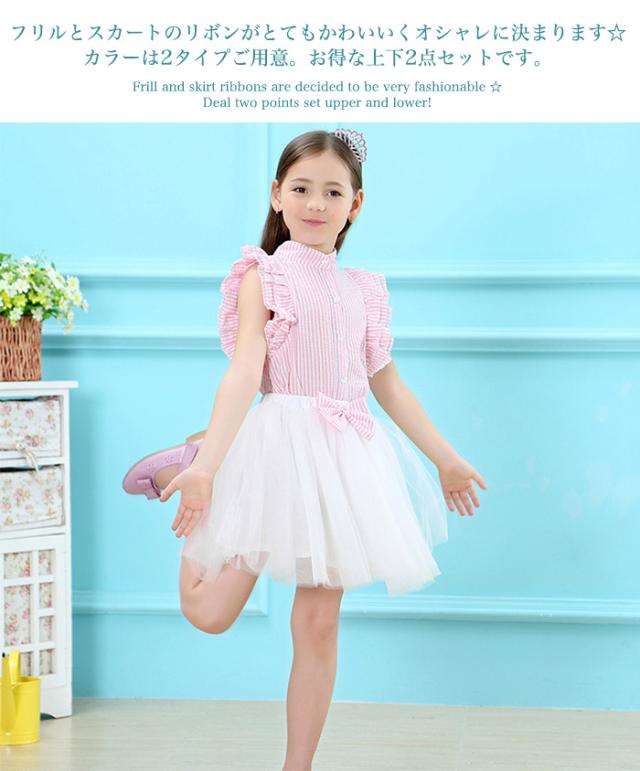 キッズ 女の子 トップス スカート 服 子供 アウター リボン 半袖 フリル ボーダー トップス 上下セット h0202