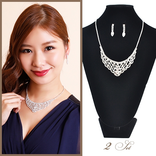 フラワー&レースデザインのネックレスに ゆれるラインストーンデザインのピアスがセットに♪