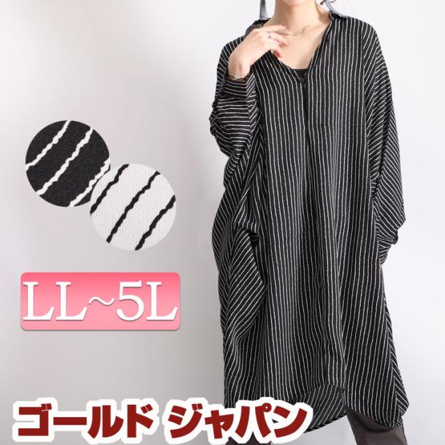 春新作 ストライプ柄ドルマンシャツチュニックワンピース 大きいサイズ レディース ワンピース ワンピ ストライプワンピース シャツワンピース ストライプ柄 ドルマン ドレープ シャツ 膝丈 春 秋 F フリー LL 2L 3L 4L 5L ブラック ホワイト ストライプ ゴールドジャパン