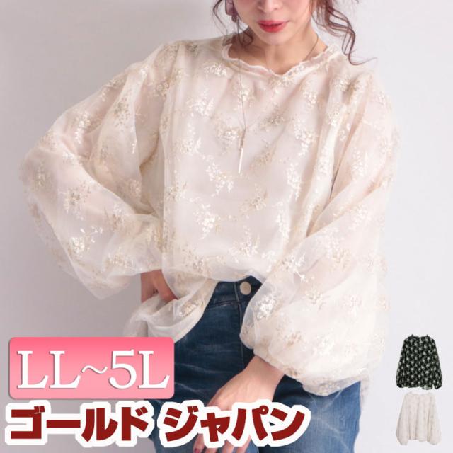 春新作 刺繍チュールボリューム袖ブラウス 大きいサイズ レディース トップス ブラウス 刺繍ブラウス チュールブラウス 長袖 刺繍 チュール 花柄 バルーンスリーブ バックシャン 花刺繍 ボリューム袖 フリルネック 裏地 フリル 春 秋 LL 2L 3L 4L ゴールド ゴールドジャパン