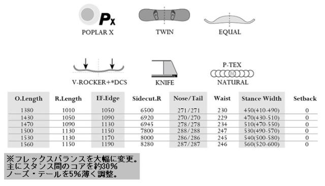 ノーズ、テールを同じ長さに設定。回転慣性も高く、空中バランスもとりやすい。パークやグラトリ、スピントリックなどに最適なシェイプ。