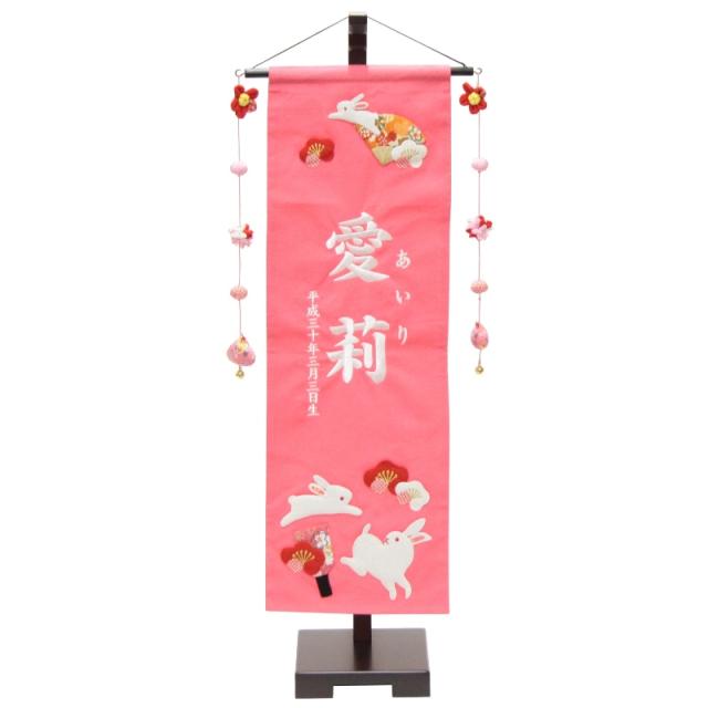 名前旗 [押絵親子うさぎ] ピンク生地 白糸刺繍文字 (大) スタンド付き 命名座敷旗 雛人形 高さ90cm [sb-3-n1-lw]