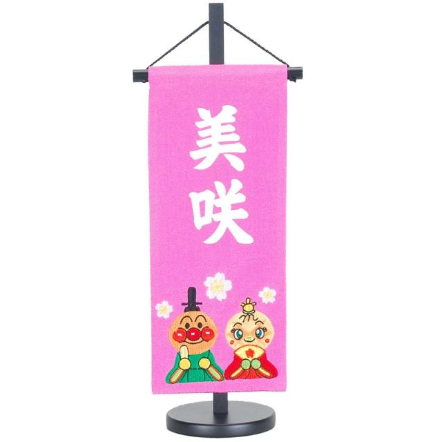 名前旗 [アンパンマン] ピンク生地 白プリント文字 (小) スタンド付き 命名座敷旗 雛人形 高さ39cm [sb-3-n7-s]