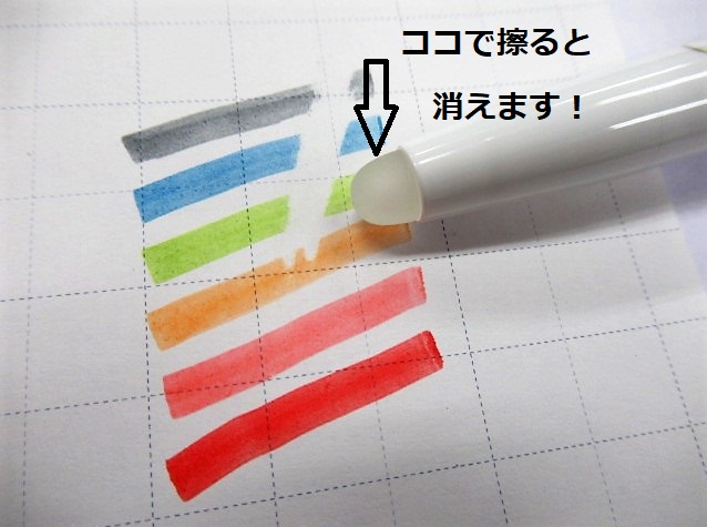 インクが乾いてからペンの後ろに付いたラバー部分で消したい部分を擦ってください。