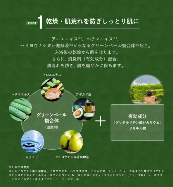 アロエエキス※1、ヘチマエキス※1、セイヨウナシ果汁発酵液※1からなるグリーンベール複合体※2配合。