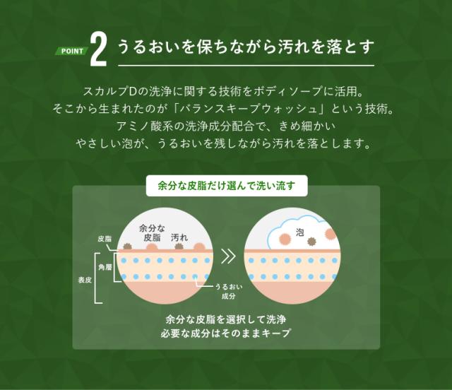 スカルプDの洗浄に関する技術を活用したボディソープなので、