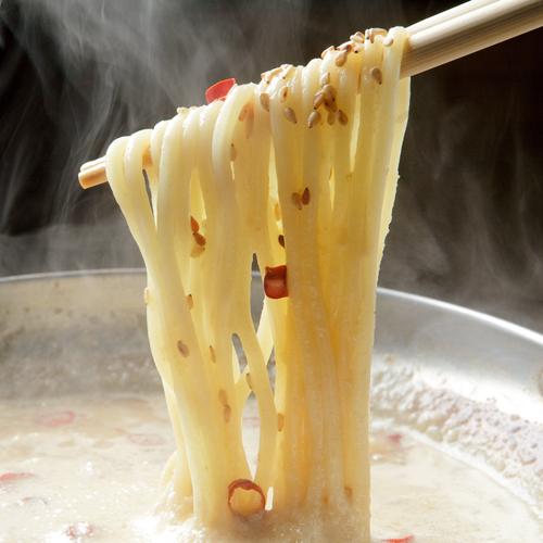 もつ鍋の具材を食べ終わったスープに、ちゃんぽん麺を入れて、じっくりと煮立って1〜2分茹で上げて下さい。麺の甘みがスープに合わさり、そのスープを麺が吸収し、最高の〆になります。
