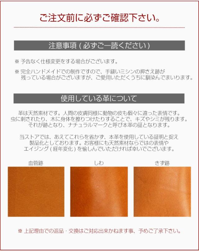使用素材である栃木レザーは、科学薬品を使用せず天然の状態に近い素材のまま製品化としておりますので、生前に木や地面に身体を擦りつけてできるキズ痕やシミ・シワなどが残っている場合がございます。当ストアではこれら(ナチュラルマーク)をあえて省かず本革を使用している証と考え商品化としております。