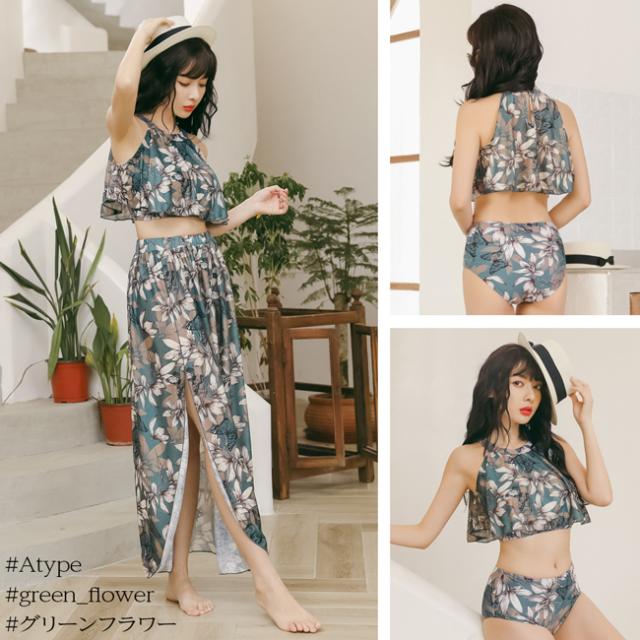 人気の大判花柄の3点セットビキニ。ロングスカートとワンピースがそれぞれセットになって登場☆