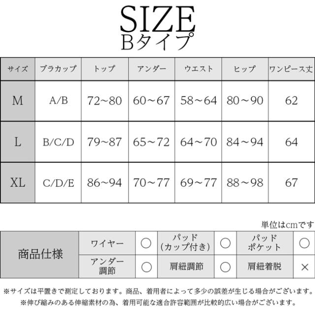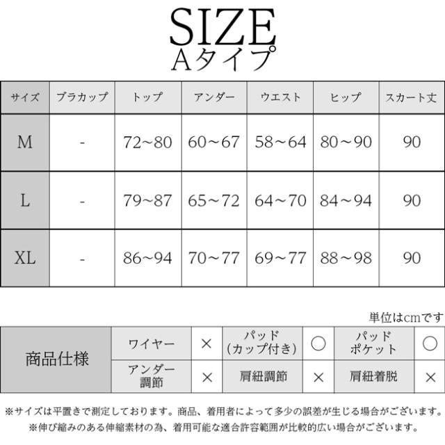 | サイズ | 【Aタイプ】 [Mサイズ] トップ:72〜80 アンダー:60〜67 ウエスト:58〜64 ヒップ:80〜90 スカート丈:90 [Lサイズ] トップ:79〜87 アンダー:65〜72 ウエスト:64〜70 ヒップ:84〜94 スカート丈:90 [XLサイズ] トップ:86〜94 アンダー:70〜77 ウエスト:69〜77 ヒップ:88〜98 スカート丈:90 【Bタイプ】 [Mサイズ] ブラカップ:A/B トップ:72〜80 アンダー:60〜67 ウエスト:58〜64 ヒップ:80〜90 ワンピース丈:62 [Lサイズ] ブラカップ:B/C/D トップ:79〜87 アンダー:65〜72 ウエスト:64〜70 ヒップ:84〜94 ワンピース丈:64 [XLサイズ] ブラカップ:C/D/E トップ:86〜94 アンダー:70〜77 ウエスト:69〜77 ヒップ:88〜98 ワンピース丈:67 ※単位はcmです。 |