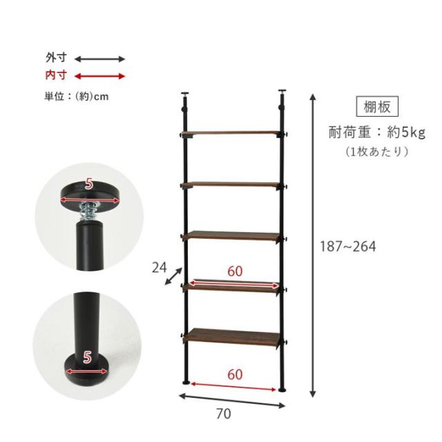 突っ張りラック 突っ張り棚 つっぱり収納棚 5段 幅70cm 突っ張り棒 間仕切り 高さ187〜264cm対応