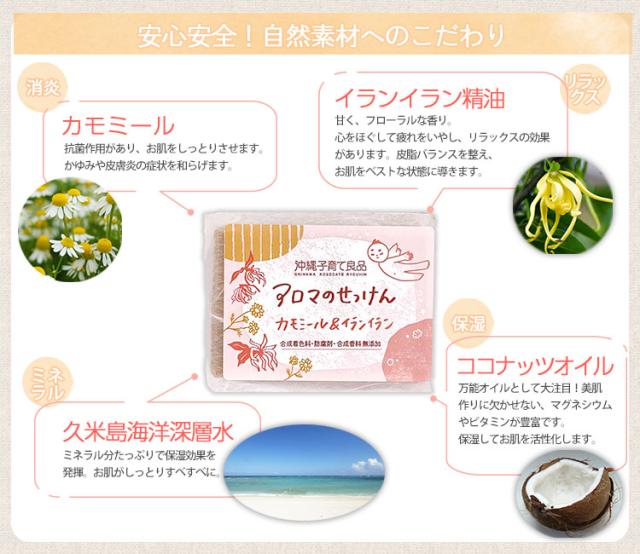 成分 石けん素地(ヤシ油、パーム油、オリーブ油、ひまわり油、水、水酸化Na)、グリセリン、久米島海洋深層水ミネラル、カモミール粉末、イランイラン精油