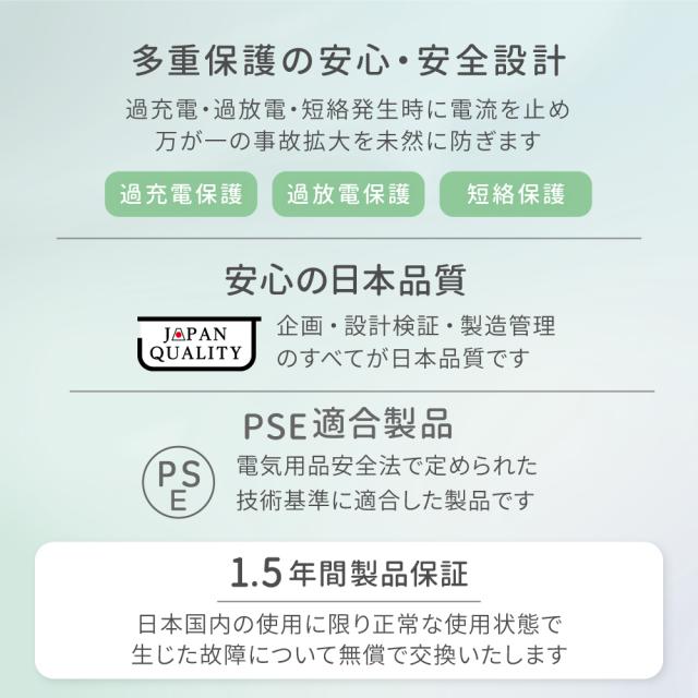 ■保護機能:過充電(電圧 / 電流)保護、過放電(電圧 / 電流)保護、短絡(ショート)保護、温度上昇抑制