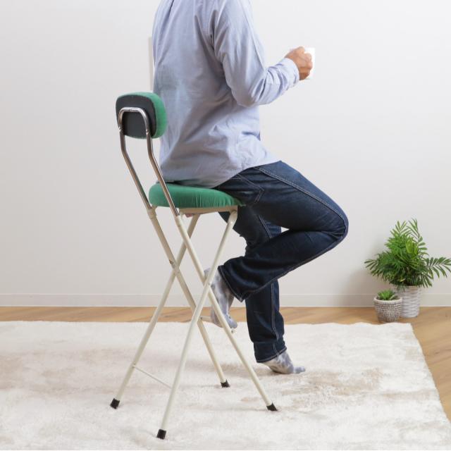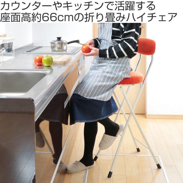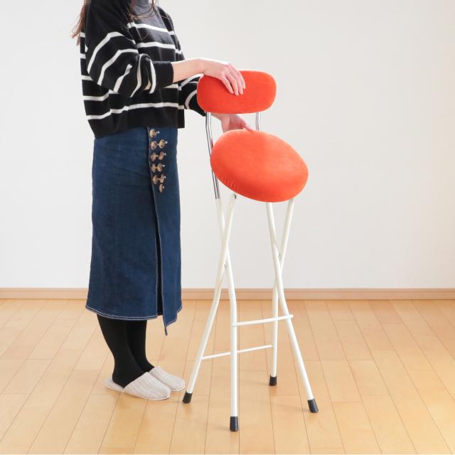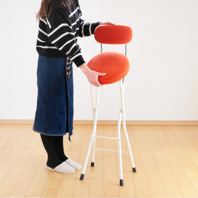 座面高約66cmのチェアは、カウンターテーブルなど少し高めのテーブルに合わせやすく、キッチンのちょっとした腰掛けに使いやすいサイズ感です。折りたたみ可能で使用しない時はコンパクトに収納でき、急な来客時の簡易チェアにもピッタリでとっても便利です。