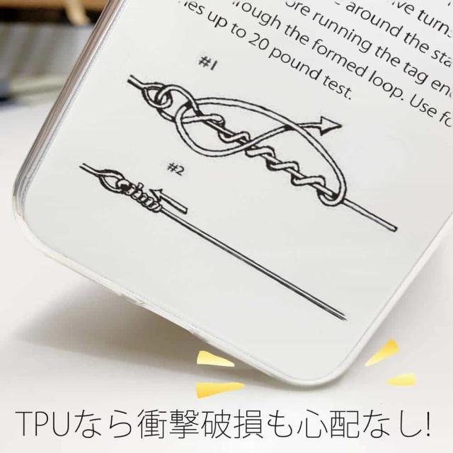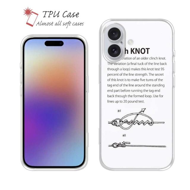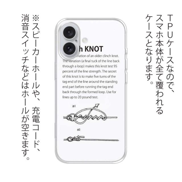 | 商品説明 | 落下や衝撃に強いTPUケース。ケースに直接プリントしてお届け。ヨリモドシ(サルカン)やオモリ、ルアーといった金具の輪に糸を接続する方法。専門用語で「サルカン結び」もしくは「クリンチノット」と呼ばれている。これを結べないと釣りができないといった結び。 |