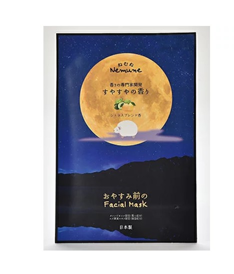 ねむねシリーズからコラーゲン・ヒアルロン酸・CoQ10などのお肌潤い成分配合フェイスマスクが登場。オレンジオイルの香り成分も配合された香りの専門家が調香したシトラスブレンドの爽やかな香りで眠りの準備を整えます。
