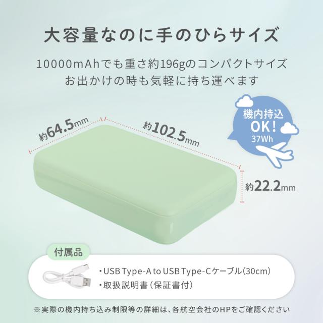 モバイルバッテリー 大容量 10,000mAh 小型軽量 USB Type-C入出力+ USB Type-A出力 1.5年保証 防災