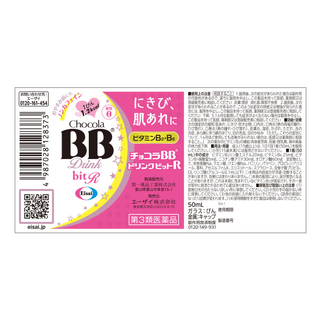 商品名 第3類医薬品 チョコラBBドリンクビットR 50mLx10本 容量 50mLx10本 JANコード 4987028128366 メーカー エーザイ カテゴリー 医療・介護・医薬品>医薬品>滋養強壮剤・ドリンク>滋養強壮剤・ドリンク【第三類医薬品】 効果・効能 次の諸症状の緩和:肌あれ、にきび・吹き出物、口内炎、口角炎(唇の両端の腫れ・ひび割れ)、口唇炎(唇の腫れ・ひび割れ)、皮膚炎、湿疹、かぶれ、ただれ、舌の炎症、赤ら顔に伴う顔のほてり、目の充血、目のかゆみ