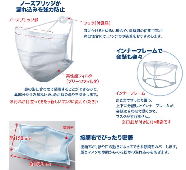 | 材質 | プリーツフィルタ:ポリプロピレン、ポリエチレン インナーフレーム:ポリエチレン 接顔布:ナイロン、ポリウレタン 耳紐部:ポリウレタン、ポリエステル、ナイロン フック:ポリエチレン |
