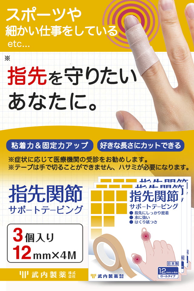 へバーデン結節 指先関節サポートテーピング 3個 12mm×4M 武内製薬 テープ 使い捨て 指サポーター 手 小指 突き指 関節 固定 結節 リウマチ 保護 第一関節 腱鞘炎 ブシャール結節 関節サポート 送料無料 メール便