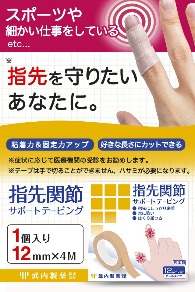 こんな方におすすめ:へバーデン結節・突き指・リウマチ・腱鞘炎のサポートのため、バレーボールなどのスポーツの怪我防止のため、性能の良いテーピングテープを探している方 など メーカー名:武内製薬株式会社