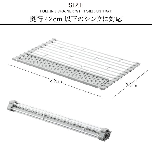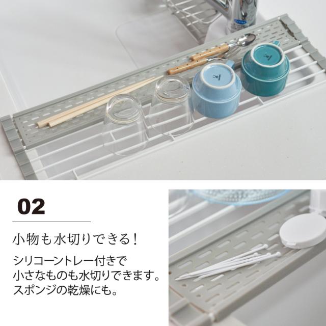 使わない時はクルッと巻いて収納できる折り畳み水切りラック。小物が置けるシリコーントレー付き!