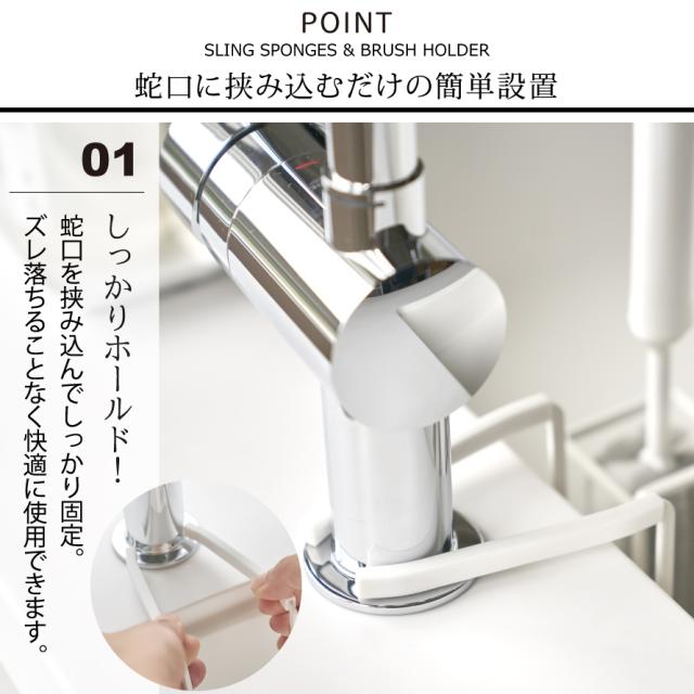 蛇口を挟み込むずれ落ちないスポンジ&ボトルブラシホルダー。挟み込むだけの簡単取り付け。スチールの取り付け部がしっかりホールドするので、ずれ落ちることなく快適に使用できます。
