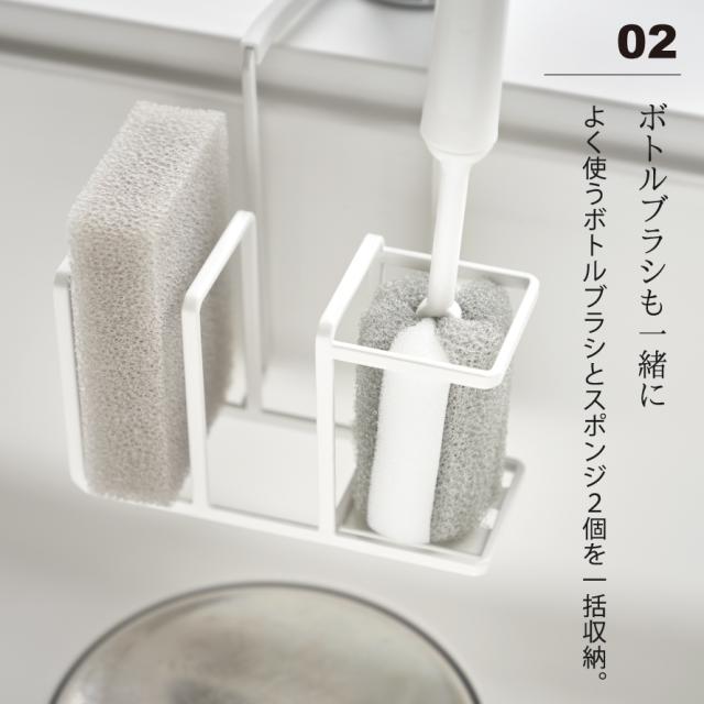 よく使うボトルブラシとスポンジ2個を一括収納。お皿用や、シンク用など用途に合わせて使い分けられます。