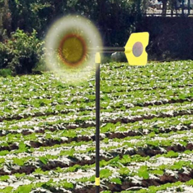 風の力でプロペラが回転して、支柱に振動が伝わって、地中のモグラを追い払います。プロペラと尾翼のホログラムが光って、鳥よけ効果があります。