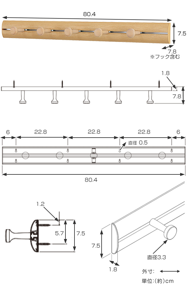 コートハンガー 壁掛け ラージレールフック 80cm ハンガーフック 木目調 ( フック 壁 レールフック 壁付け ハンガー ウォールフック 玄関 収納 壁掛けフック コート掛け 木目 北欧 インテリア おしゃれ )