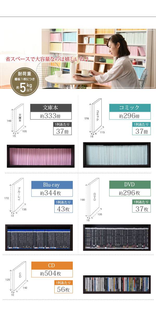 [収納量](文庫本)約333冊、(コミック)約296冊、(DVD)約296枚、(CD)約504枚、(Blu-ray)約344枚