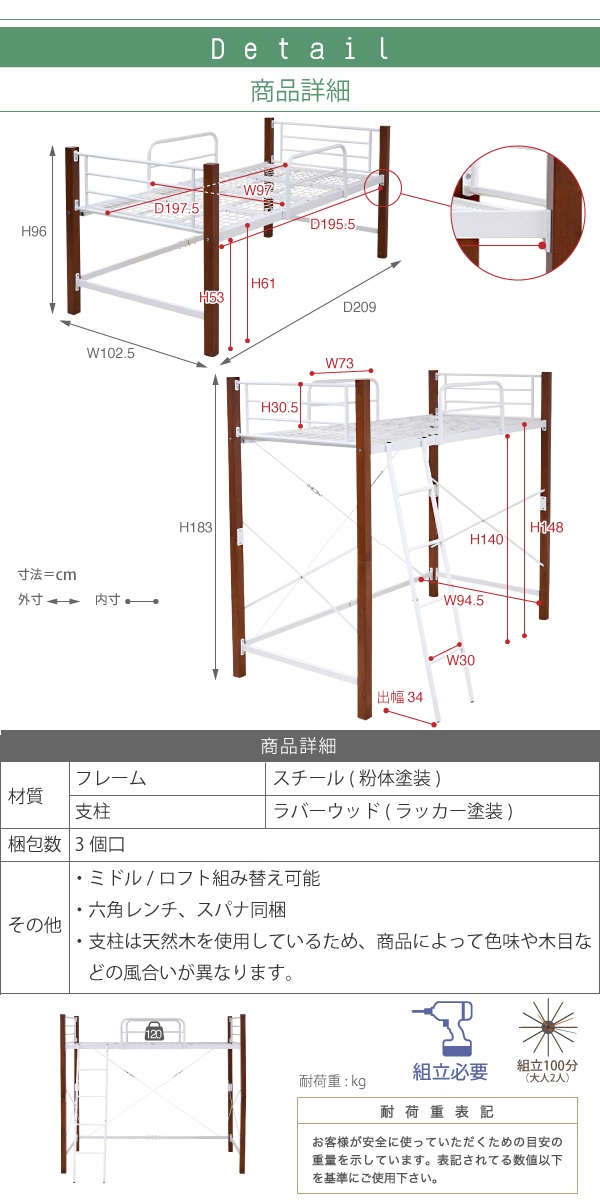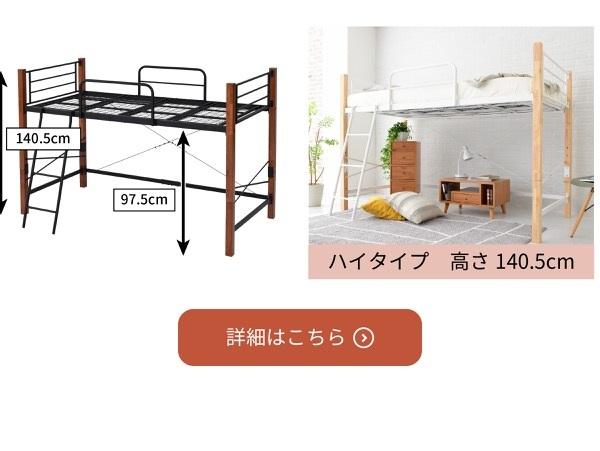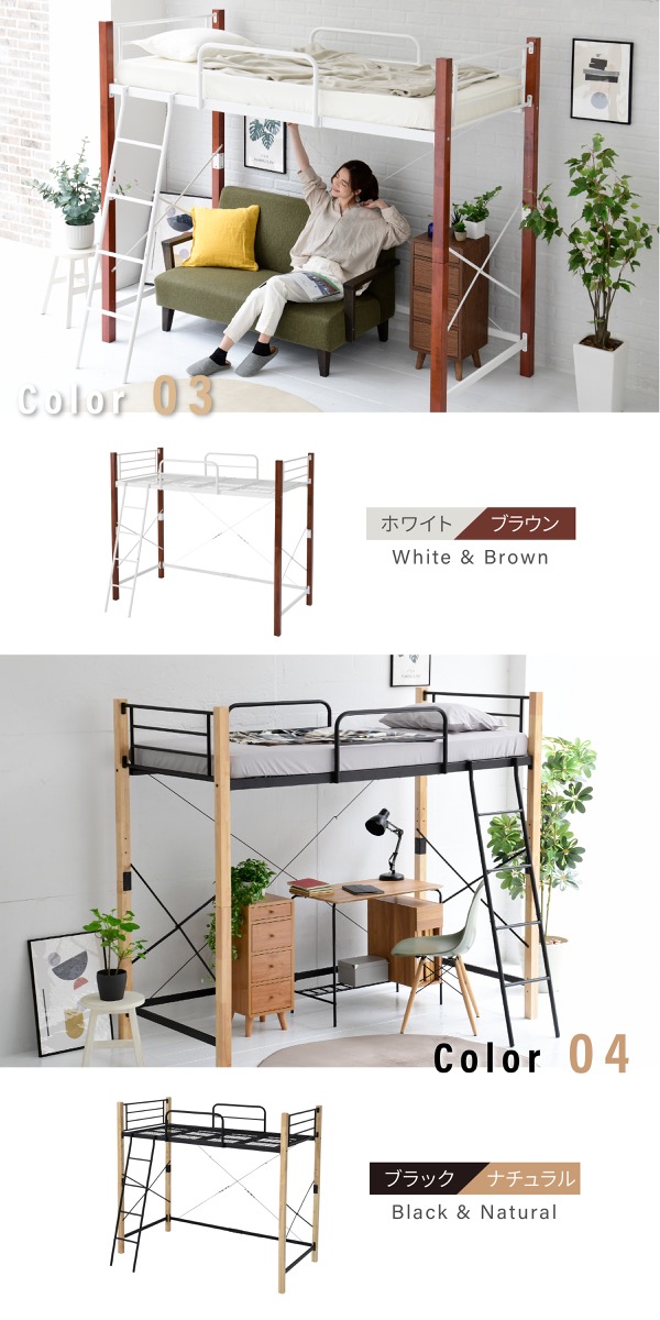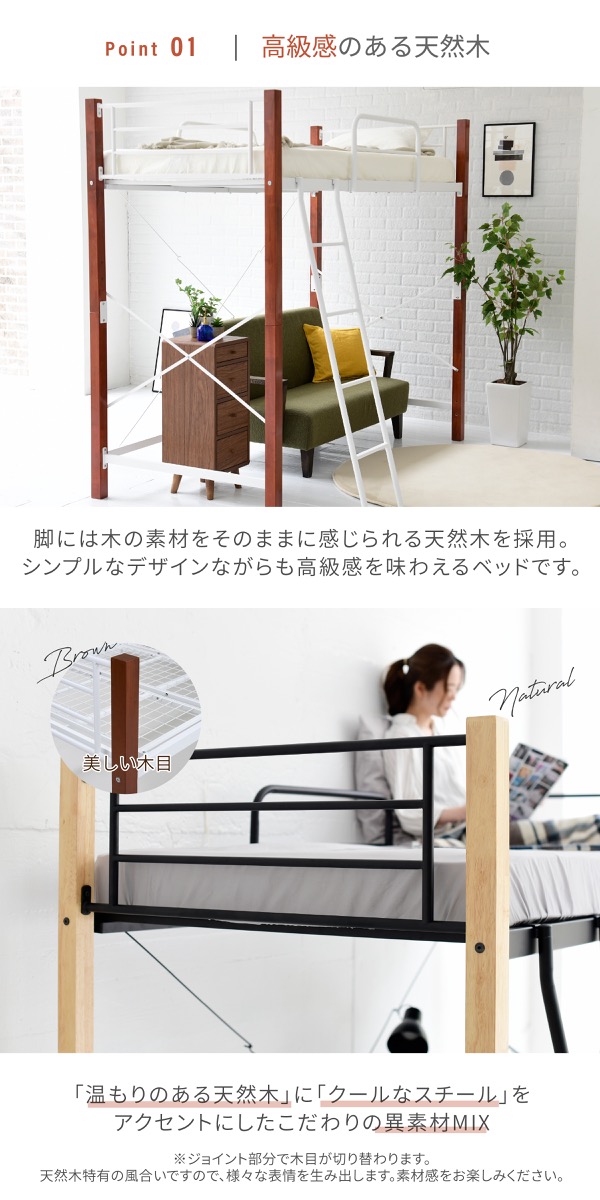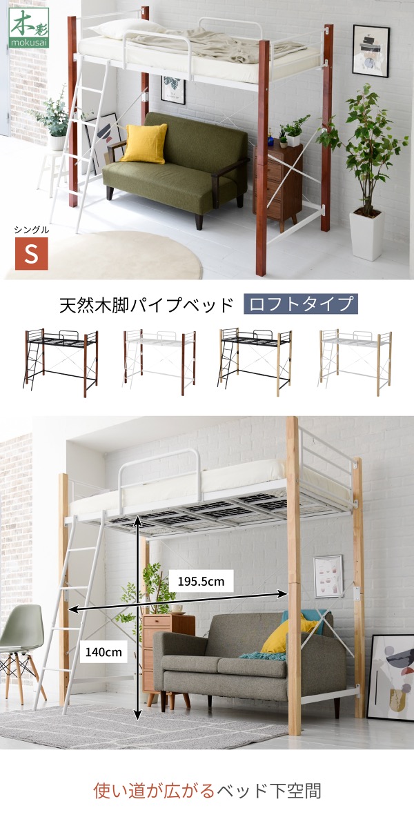 天然木脚 ロフトベッド シングル パイプベッド ロフト 高さ 183 長さ 209 木製式ベッド 天然木 頑丈 丈夫 有効活用 新生活 インテリア 極太 新生活 引越し 家具 沖縄 離島別途送料見積もり メーカーより直送します IRI-1043SET