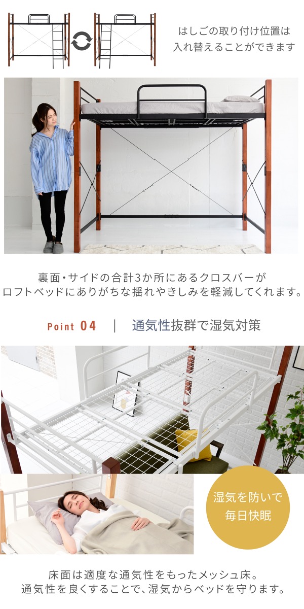 温かみのある天然木とクールなスチールのコントラストがおしゃれな、お部屋のスペースを有効活用できるロフトベッド。