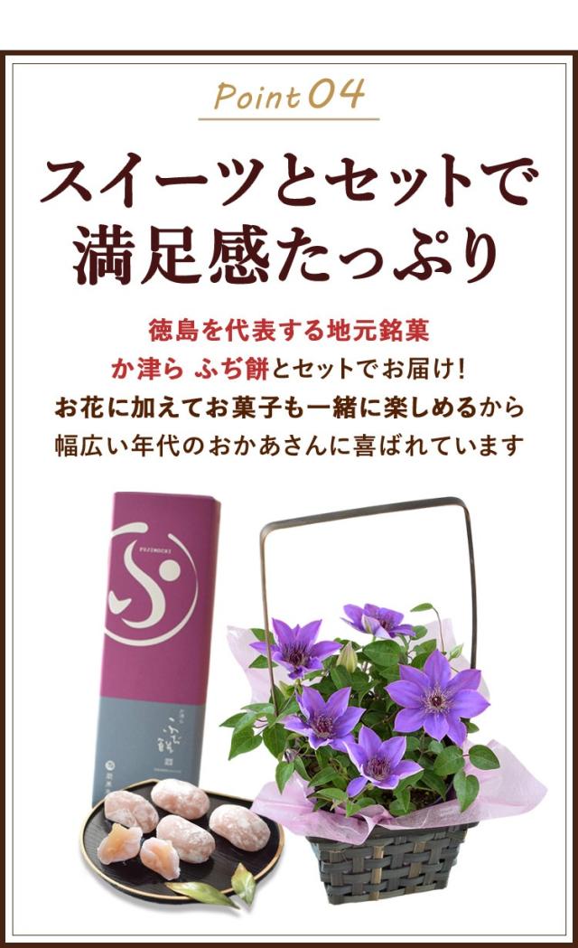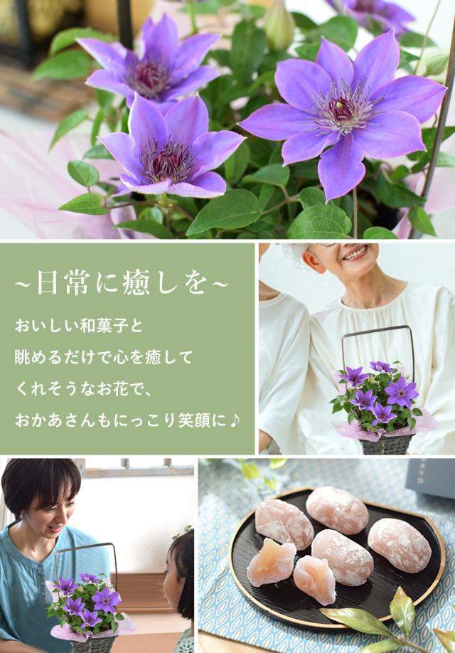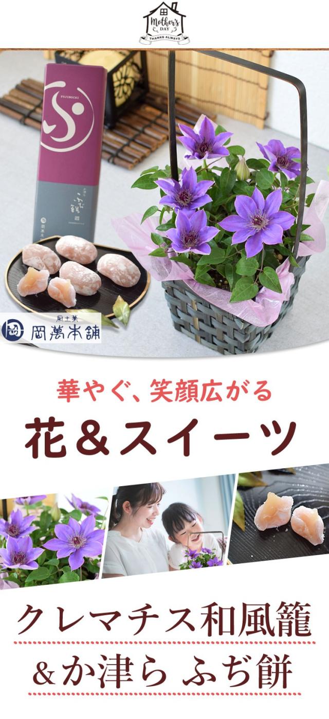 超早割 母の日 2026 花 鉢植え 花とスイーツ クレマチス 和風籠 & 岡萬本舗 か津ら ふぢ餅 セット 花とスイーツセット ミゼットブルー 和菓子 スイーツ お菓子 ギフト プレゼント 和風 鉢花 花鉢 毎年 咲く 多年草 甘味 お花 母 母親 義母 母の日プレゼント 母の日ギフト