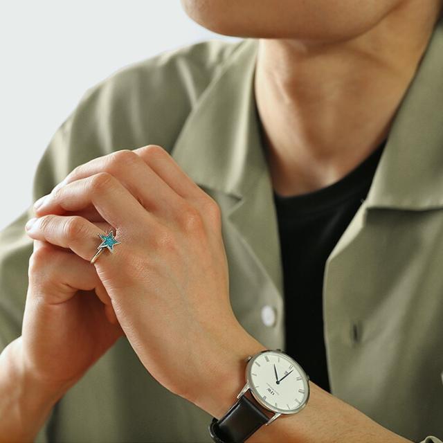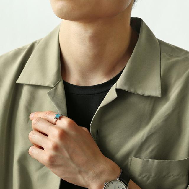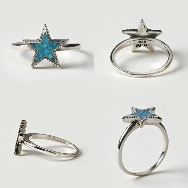 スター(星)の中央に、大小様々な形のクラッシュターコイズを埋め込んだリング。星の周りのふち取りがターコイズと合わせて爽やかなネイティブ感を演出します。ピンキーリングとしてコーデのアクセントに。細めのリング幅なので女性の方にもオススメです。