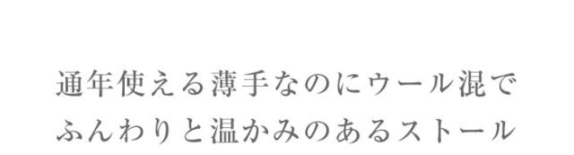 | 商品説明 | 通年使える薄手なのにウール混で、ふんわりと温かみのあるストールです。透け感のある薄手素材ですが、ボリュームがたっぷりなので、首回りを優しく包み込んでくれます。シーズンカラーが入った、トレンドコーディネートと相性の良い色展開。発色の良い豊富なカラーなので、ギフトやコーディネートに合わせてお好みのカラーをお選びください。優しい風合いでオシャレのワンポイントや、冷房対策、紫外線対策にピッタリです。薄手でコンパクトになるので、バッグにも収納しやすく持ち運びも便利。 |