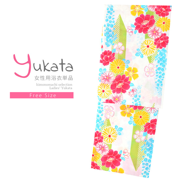 浴衣 レディース 単品「白地 黄緑、矢羽根 花々」フリーサイズ レトロ モダン 大人柄 女性浴衣単品 女浴衣 ゆかた yukata 【メール便不可】
