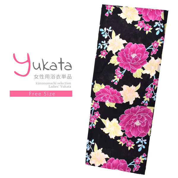 浴衣 レディース 単品「黒地 牡丹に百合」フリーサイズ レトロ モダン 大人柄 女性浴衣単品 女浴衣 ゆかた yukata 【メール便不可】ss2506ykl10