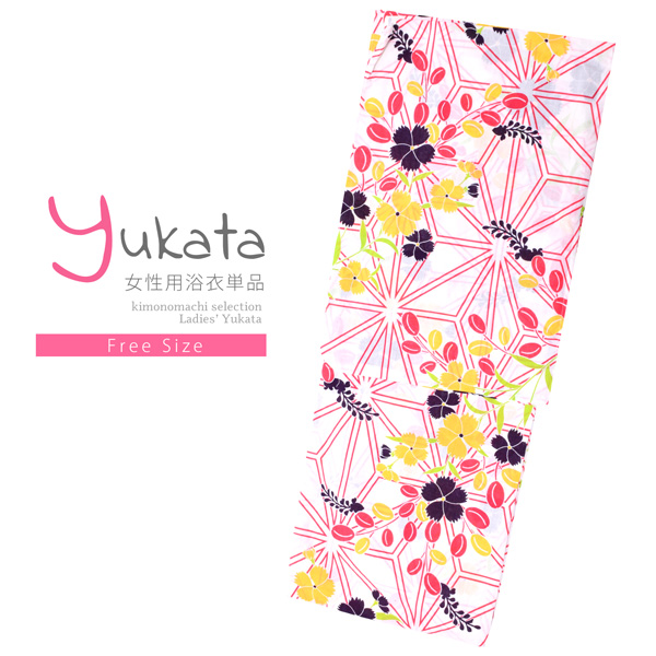浴衣 レディース 単品「白地 麻の葉に撫子」フリーサイズ レトロ モダン 大人柄 女性浴衣単品 女浴衣 ゆかた yukata 【メール便不可】