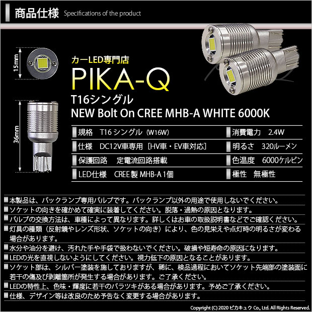 | T16規格バックランプ専用LEDバルブ。ボルトオンCREEがリニューアルしました。 CREE MHB-Aを搭載し、全光束は90lmの約3.5倍、320lmにパワーアップ! 素子1個の最大全光束は500lmですが、出力を64%に抑えた安全設計で、明るさと長寿命を両立しています。 定電流回路を搭載し、急激な電圧変化に影響されず安定した点灯を持続。ハイブリッド車・EV車にも対応します。 消灯時には目立ちにくいシルバーソケットと、メッキボディがリフレクターに違和感なく収まります。全長は36mmと純正同等サイズのため、バックランプがT16規格の全車両に取付可能です。 | ||||