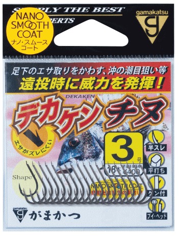 沖のカケアガリを攻める、手前のエサ取りをかわす。「デカケンチヌ」は、これらの遠投が必要な状況で威力を発揮するアイテムです。軸部に施した「デカケン」と、オキアミの身割れを防ぐ「ナノスムースコート」により、遠投時に発生するエサズレを解消!遠投以外でも、強風時の強い振り込みにも威力を発揮します。アワセの力が伝わりにくい遠距離での刺さりの良さと、仕掛回収時の鈎の回転を防ぐ「ヒネリなし」仕様。不意の大型とも安心して渡り合える頑丈設計です。