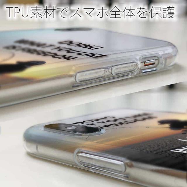| ケースの素材について | 側面はゴムのように柔らかいTPU素材で、スマホ本体を守ります。万が一の落下でもケースが割れることがなく、耐久性の高いケースとなります。クリア(透明)のTPUケースにプリントしていますので、スマホ本体のカラーを活かしながらデザインケースが楽しめます。 |