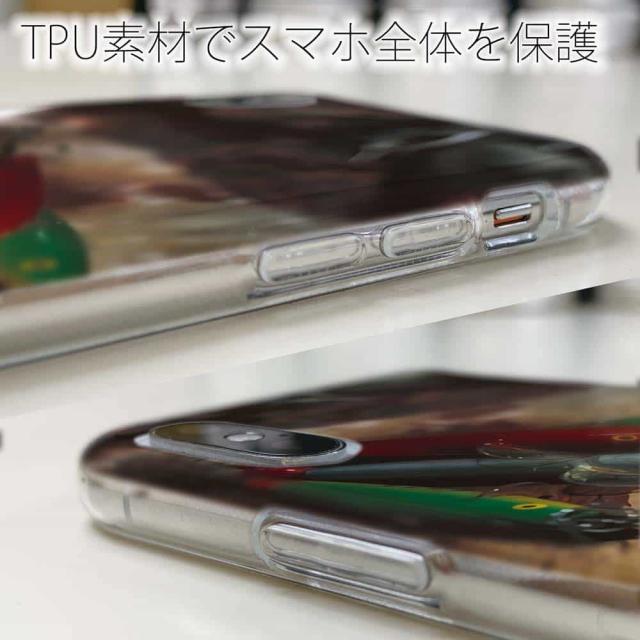 | ケースの素材について | 側面はゴムのように柔らかいTPU素材で、スマホ本体を守ります。万が一の落下でもケースが割れることがなく、耐久性の高いケースとなります。クリア(透明)のTPUケースにプリントしていますので、スマホ本体のカラーを活かしながらデザインケースが楽しめます。 |