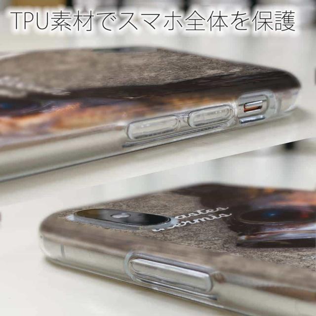 | ケースの素材について | 側面はゴムのように柔らかいTPU素材で、スマホ本体を守ります。万が一の落下でもケースが割れることがなく、耐久性の高いケースとなります。クリア(透明)のTPUケースにプリントしていますので、スマホ本体のカラーを活かしながらデザインケースが楽しめます。 |